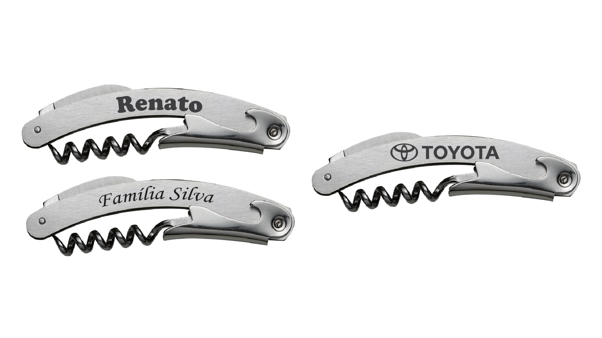 Descrição: Saca-rolhas metálico (Inox) com lâmina de corte e abridor de garrafa.